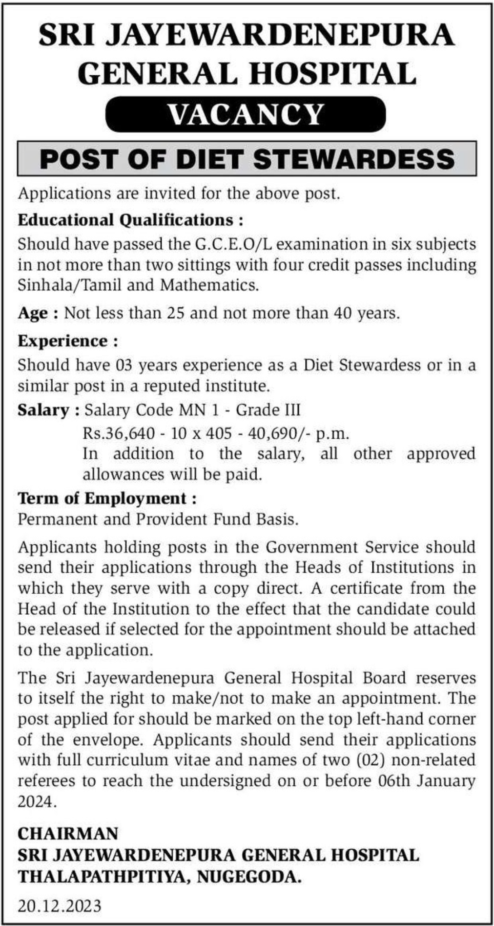Applications are invited island wide for the Diet Stewardess job vacancy at the Sri Jayewardenepura General Hospital. The application period for this vacancy concludes on January 06, 2024. Government job vacancies in Sri Lanka. Job Vacancies in Sri Lanka.